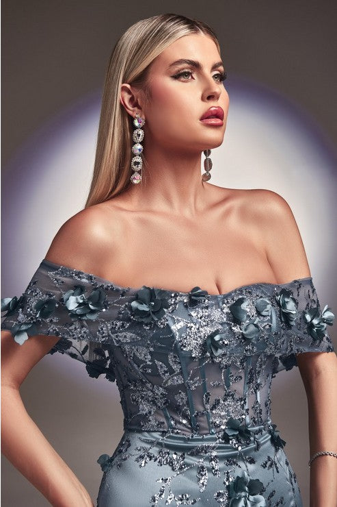 Smoky Blue Floral Print Fitted Off The Shoulder Gown
