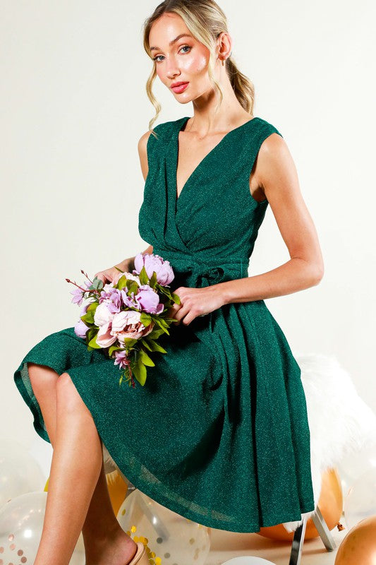 V-Neck Sleeveless Tie Waist Metalic Mini Dress