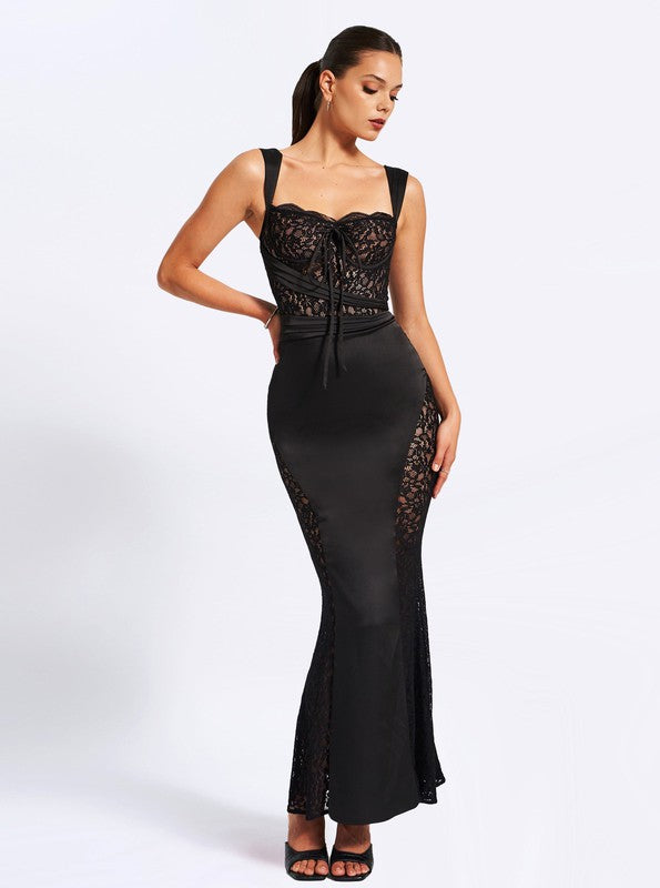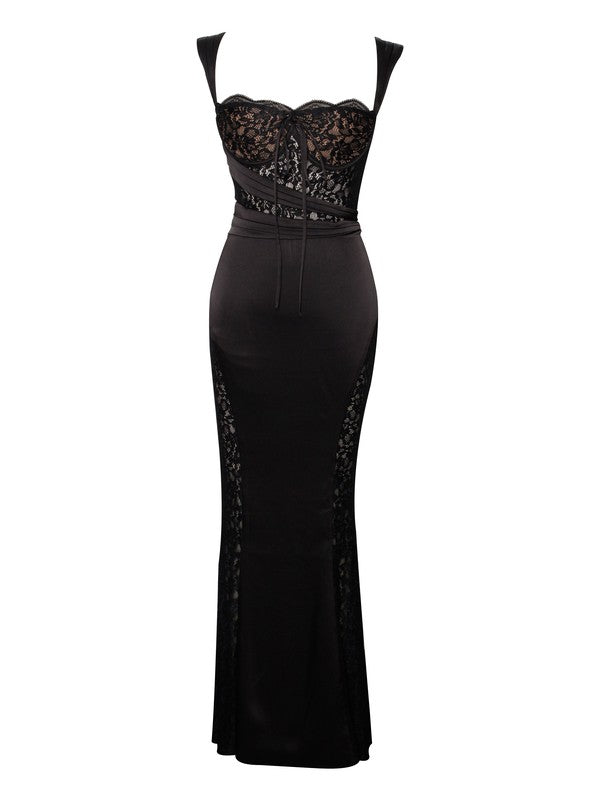 Umica Black Lace And Satin Maxi DressMaterials: Lace / Double Duchess SatinLength: From Underarm. Approx 50.39inch / 128cmStretch Factor: Non StretchModel Is Wearing A Size XS (US-2)Model Is 5'11''Clean: Dry-Clean Only