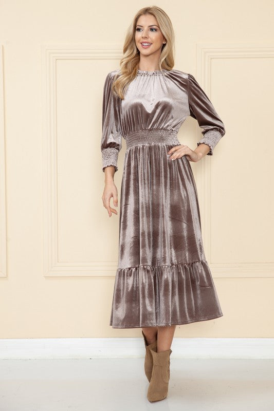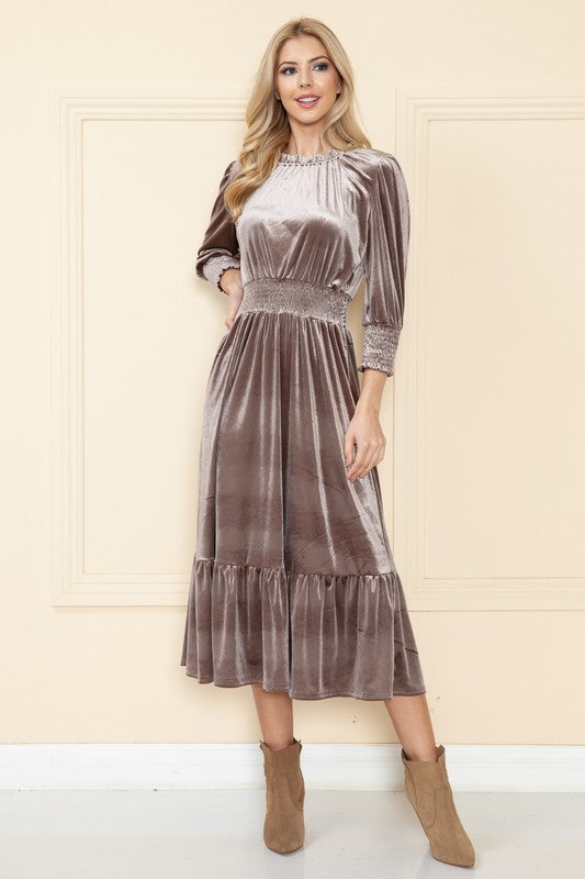 Mocha Velvet Three Quarter Sleeve Midi Dress