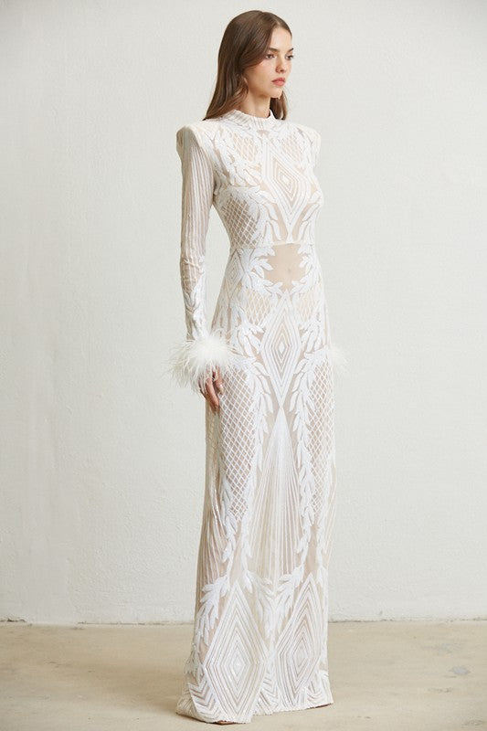 Dress- Baroque Sequin Pattern Sheer Mesh Fabric- Mockneck- Padded Shoulder- Feather Trim Sleeve Cuff- A-Line, Floor Length Finished Hemline- Invisible Zipper BackFabric Contents- 100% Polyester