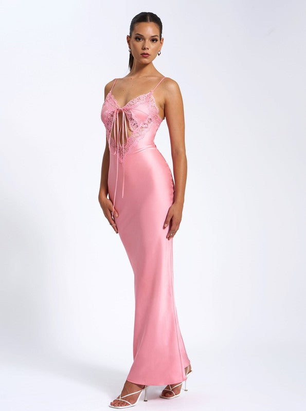 Zinnia Salmon Pink Satin Lace Maxi DressMaterials: Double Duchess SatinLength: From Underarm. Approx 52inch / 132cmStretch Factor: Non StretchModel Is Wearing A Size Xs (Us-2)Model Is 5'11''Clean: Dry-Clean Only