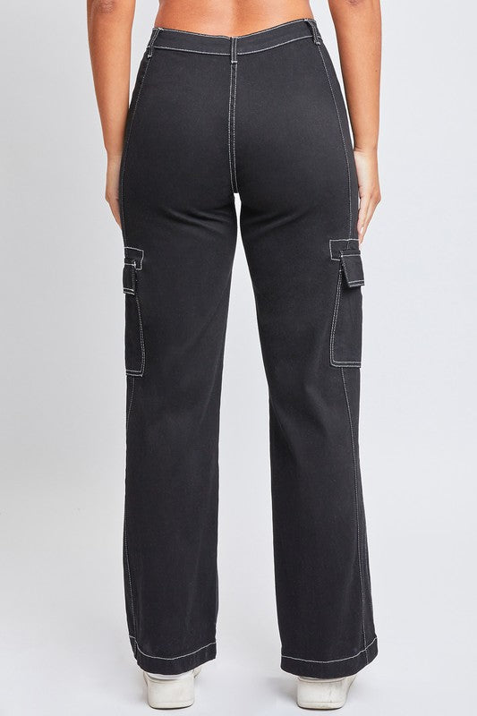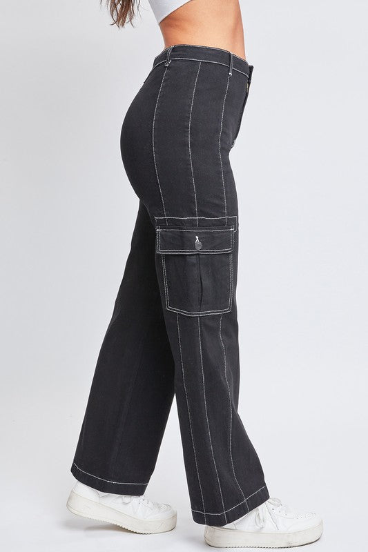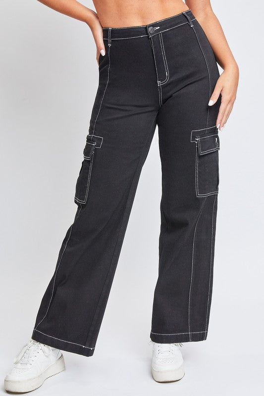 We'Re Living In These Junior High-Rise Cargo Pants With Front Seam Detail All Season Long! We'Ve Omitted Front And Back Pockets So That This High-Waisted Pant Really Accentuates Your Natural Shape, And Added A Vertical Front Seam To Draw The Eye And Create The Illusion Of A Longer Leg. Features Contrast Stitching Throughout, Flap Button Cargo Pockets With Pleated Detail, And A Relaxed Straight Leg For Comfort And An Ultra-Flattering Silhouette. Style With A Bandeau Top And Sandals For A Daytime Look, Or A Fitted Long Sleeve With Heels For A Night On The Town.