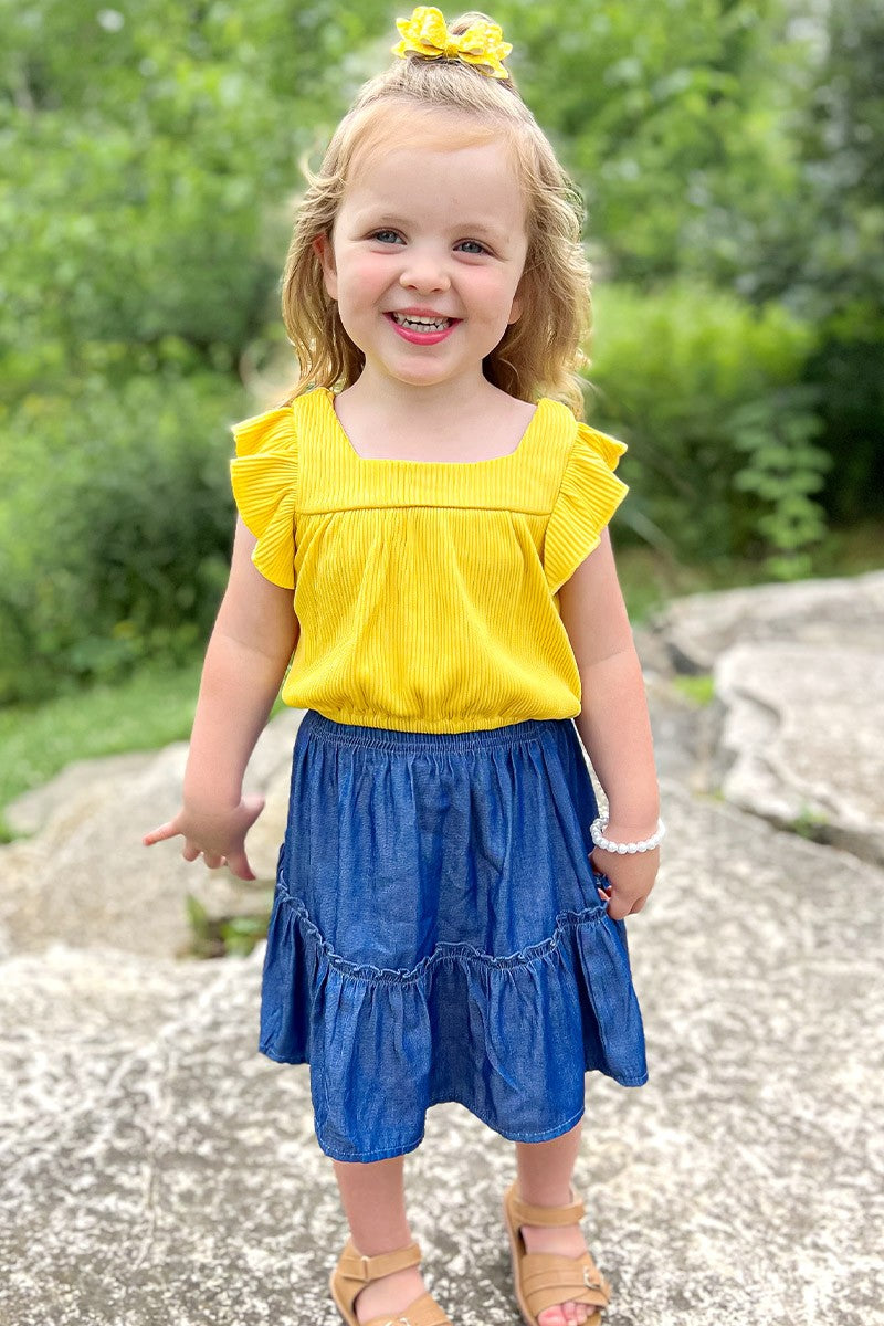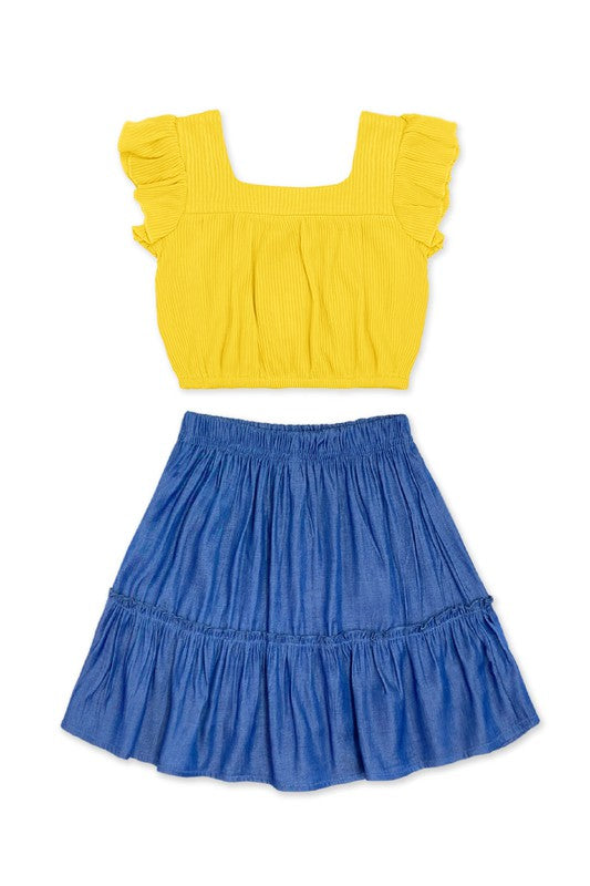 Girl's 2 Pc Denim Chambray Skirt Set W/Ruffled TopFabric ContentsTop: 95% Polyester / 5% SpandexBottom: 50% Polyester / 50% Rayon
