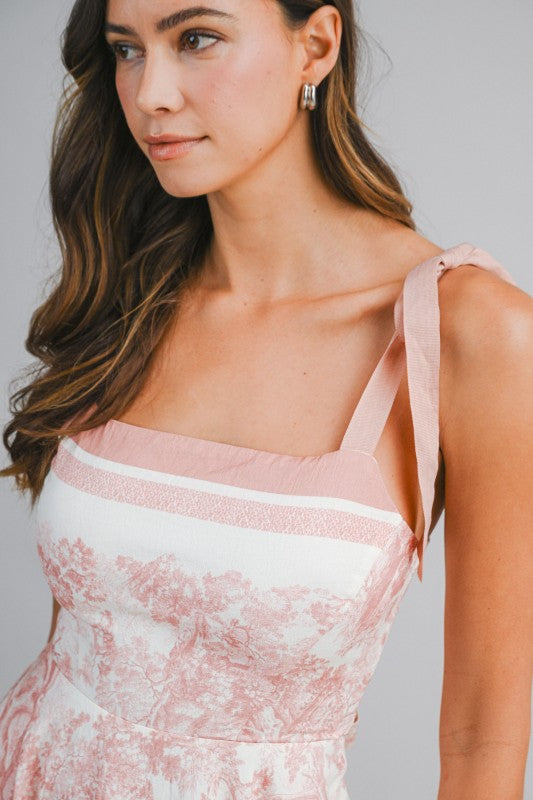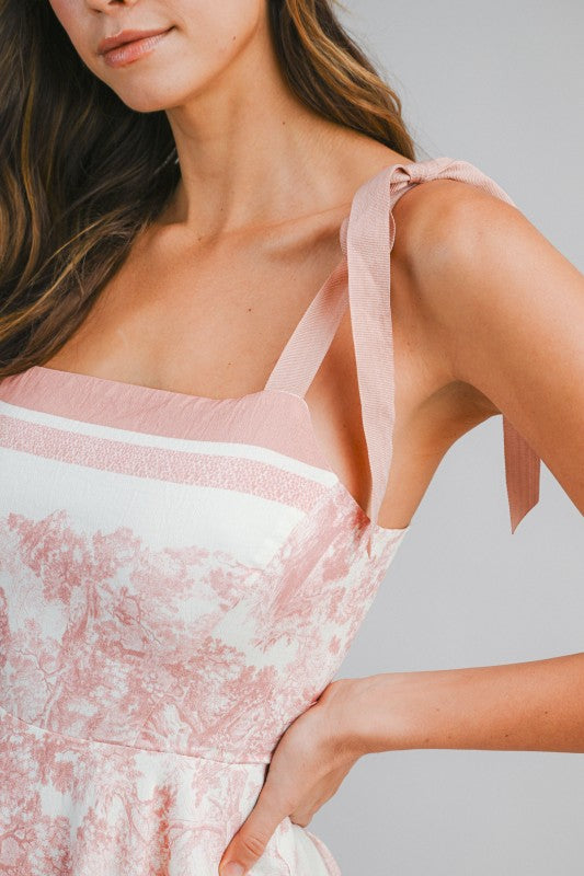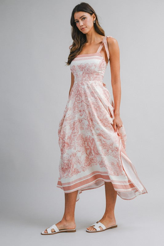 Border Print Midi Dress Featuring Self Tie Shoulder Straps And A Straight Neckline. Designed With A Fitted Bodice And A Handkerchief-Style Hemline. Back Smocked, Self Tie Detail And Invisible Zipper. Lining.