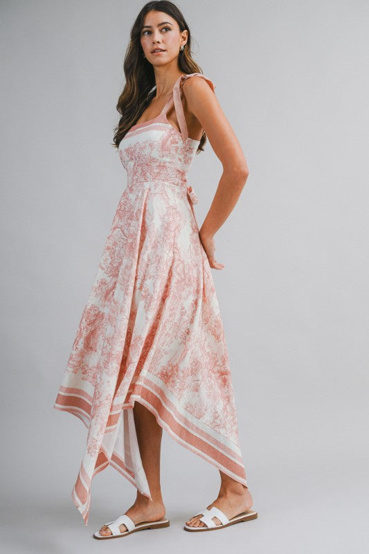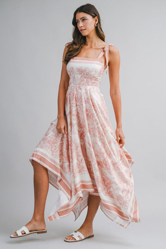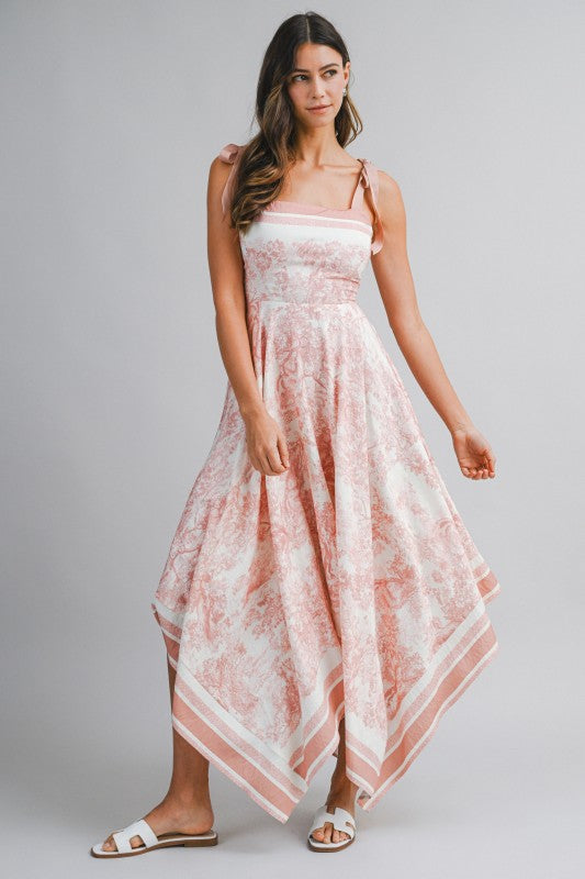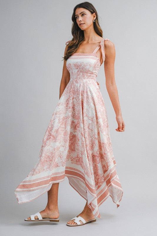 Dusty Pink Border Print Hankerchief-hem Midi Dress