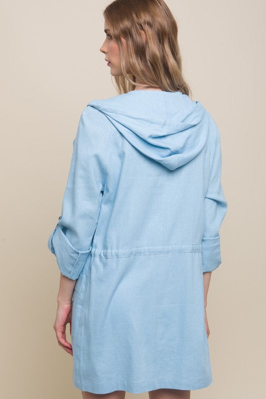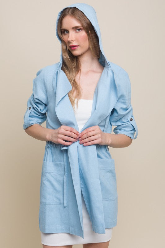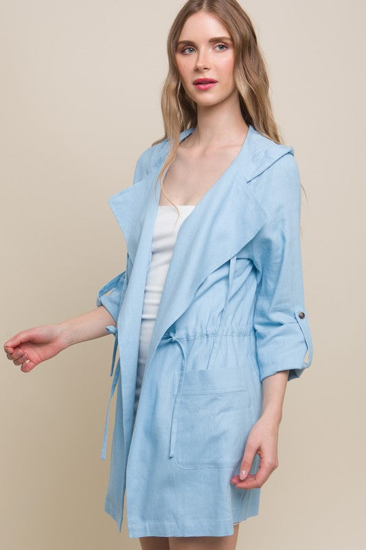 Baby Blue Open Front Hoodie Trench Linen Jacket