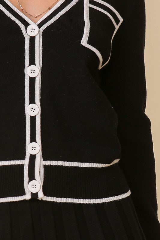 Set-long Sleeve Button Down Cardigan Sweater Top With Front Pockets And Pleated Matching SkirtSweater Fabric50% Viscose 28% Polyester 22% Nylon