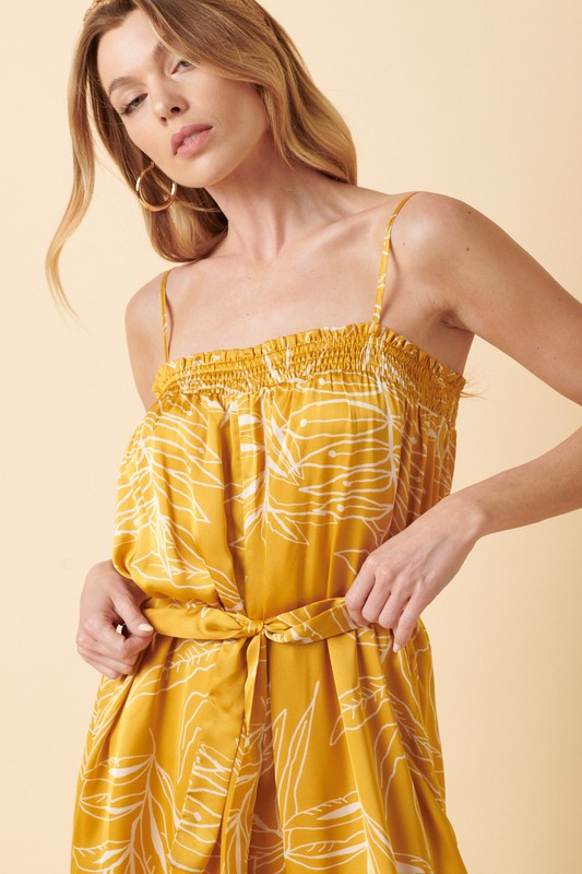Leaf Print On Satin FabricSpaghetti Strap With Adjustment TrimSmocking DetailWide LegSide PocketWaist Belt TieModel Is 5'9" And Is Wearing Size SmallFabric Contents100% Polyester