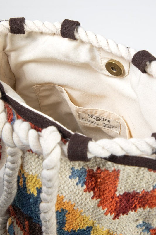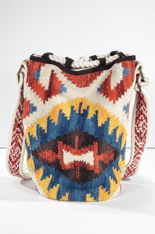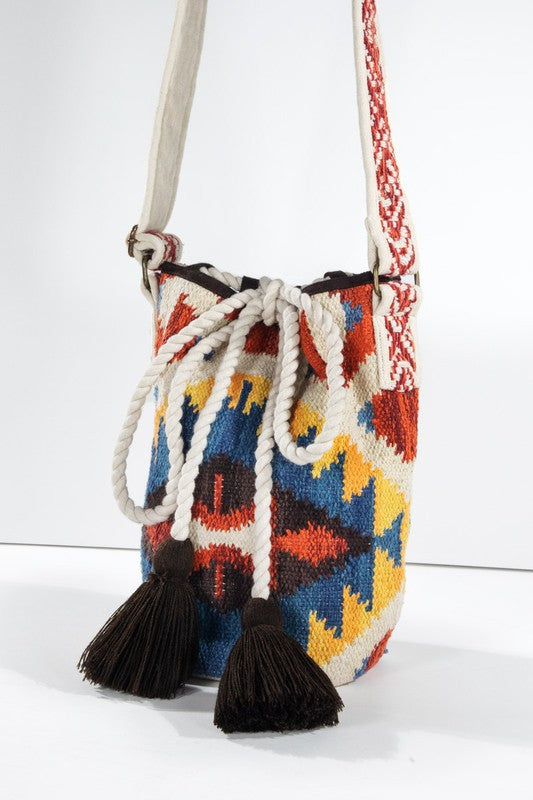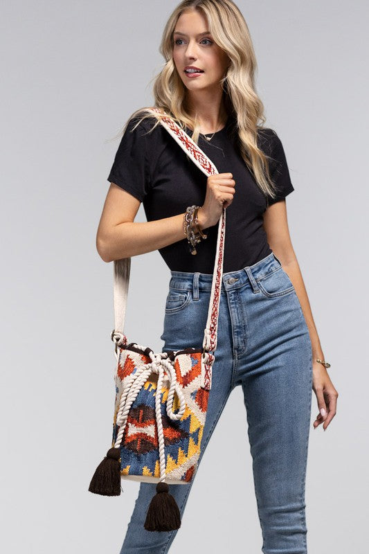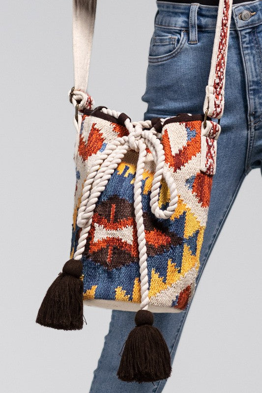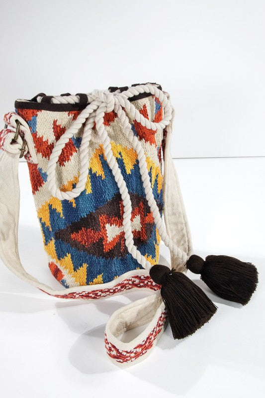 Handwoven Ethnic Navajo Pattern With A Rope And Tassel Closure And A Magnet Button Closure. Also, Features Adjustable Shoulder Strap And A Large Slip Pocket On The Inside Of The Fully Fine Cotton Bucket Shoulder Bag