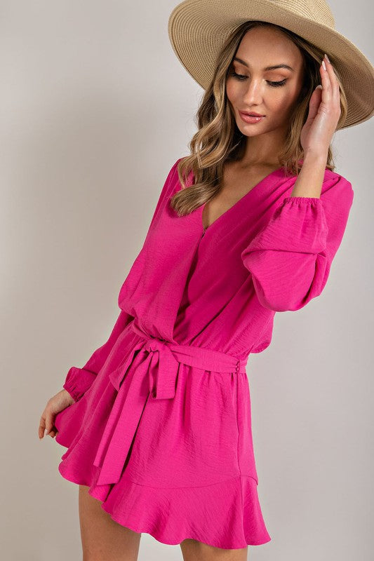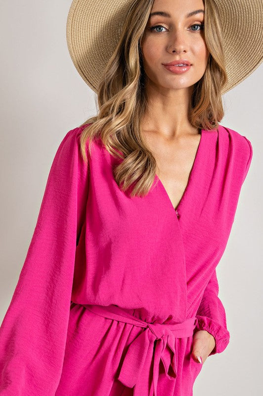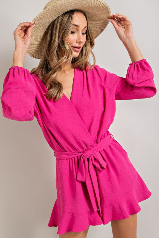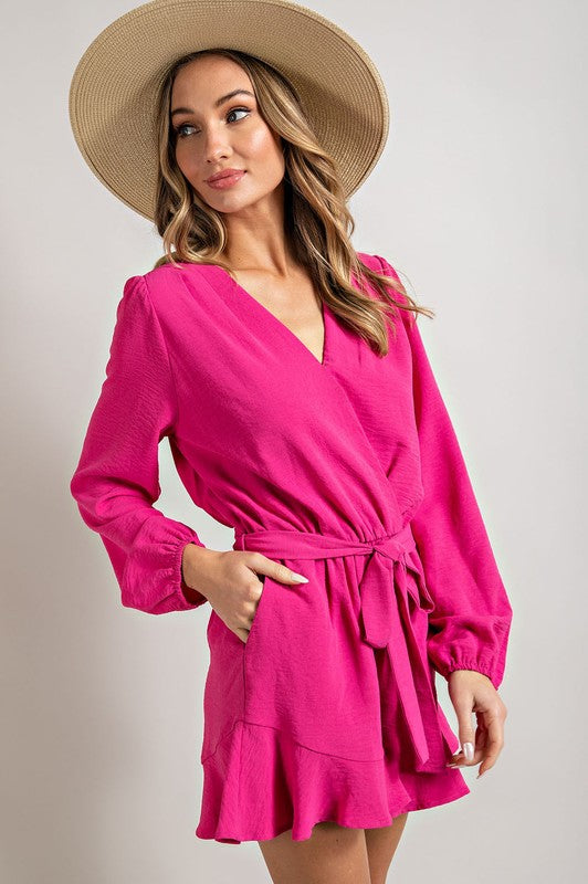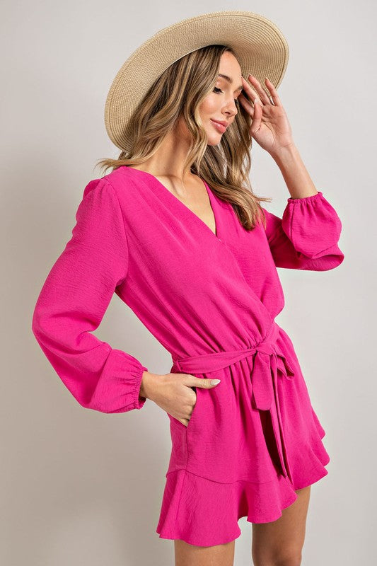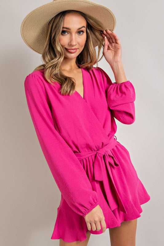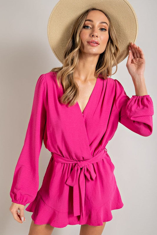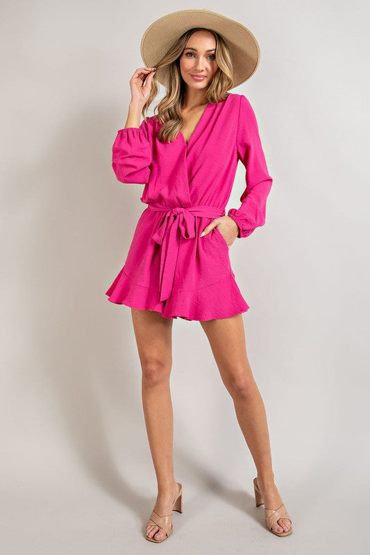 V-neck Romper Featuring Long Sleeves, A Waist Tie, And A Tiered Hem Design. Go For That Simple, But Classy Look With This Romper!