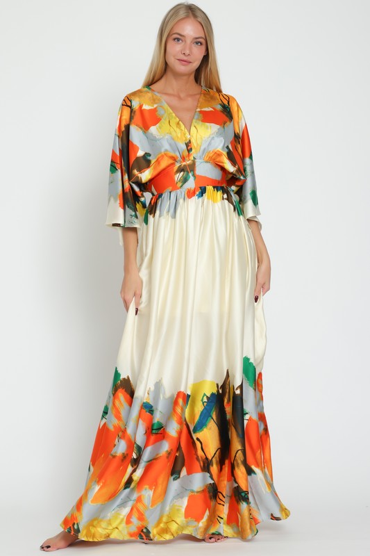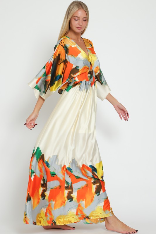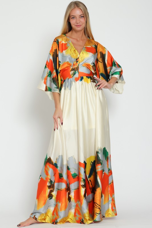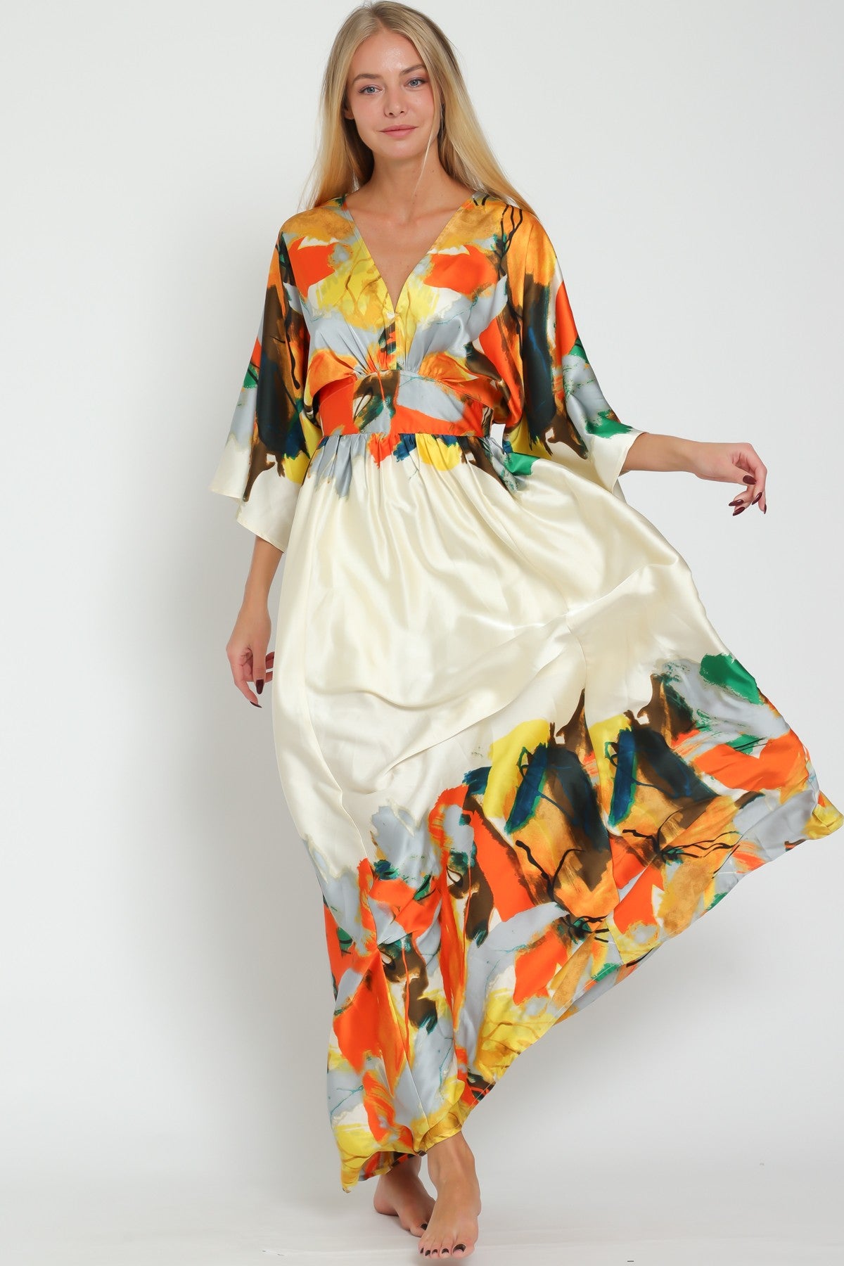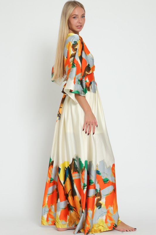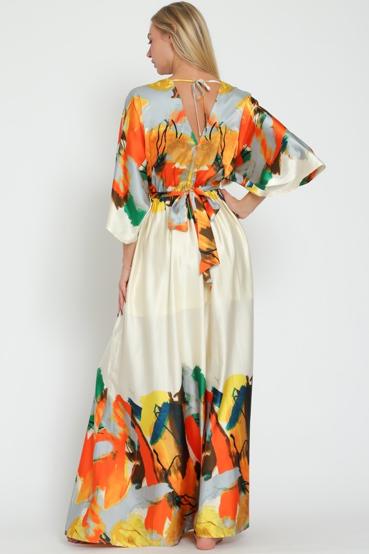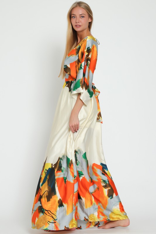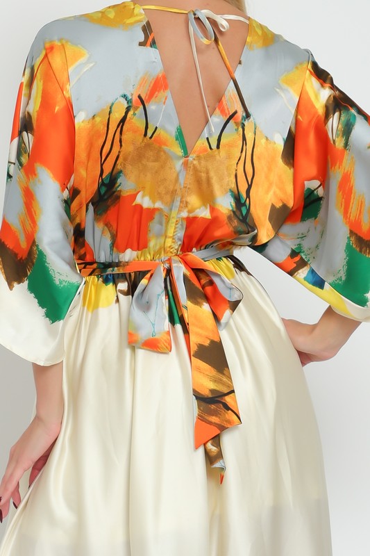 Cream/Tangerine Kimono Sleeve Tie Back Waisted Border Maxi Dress