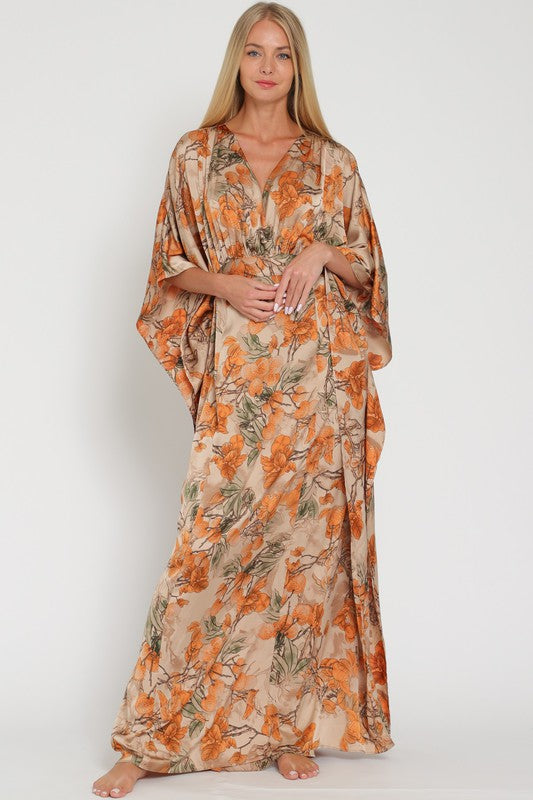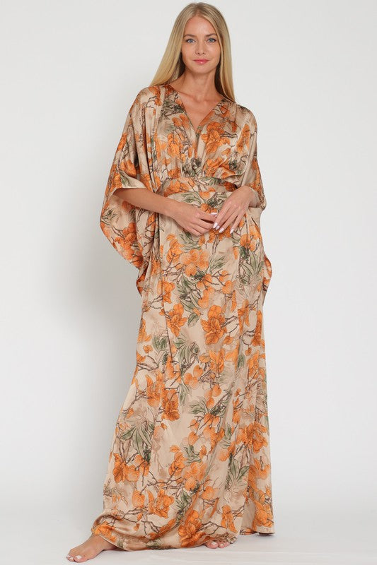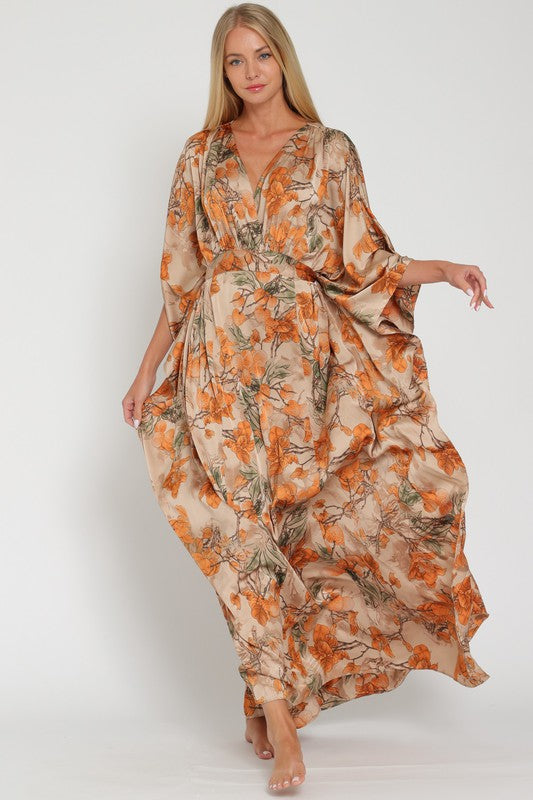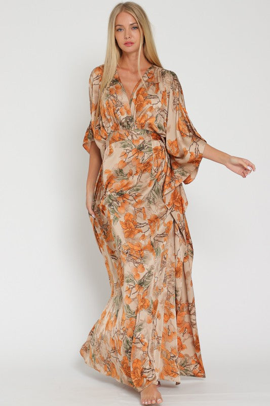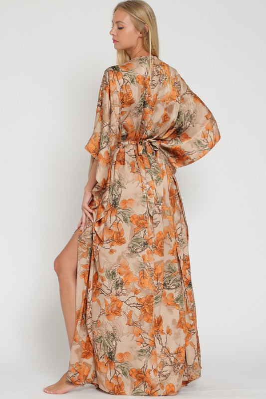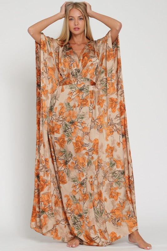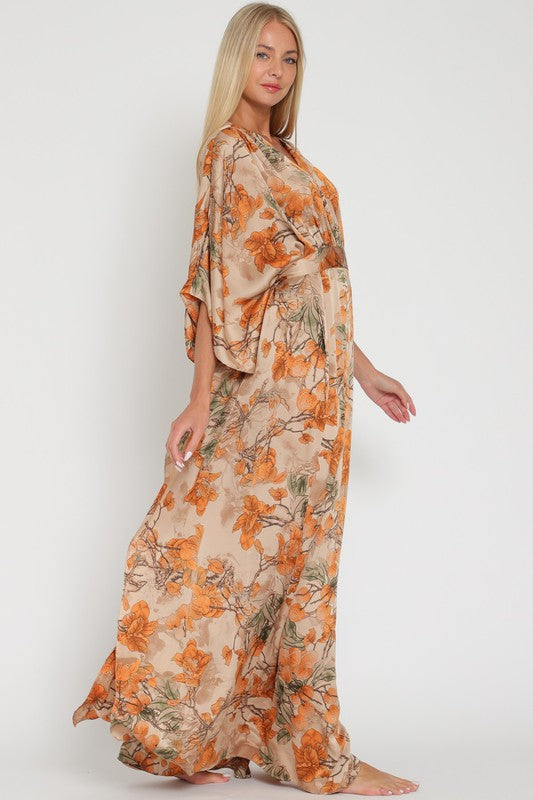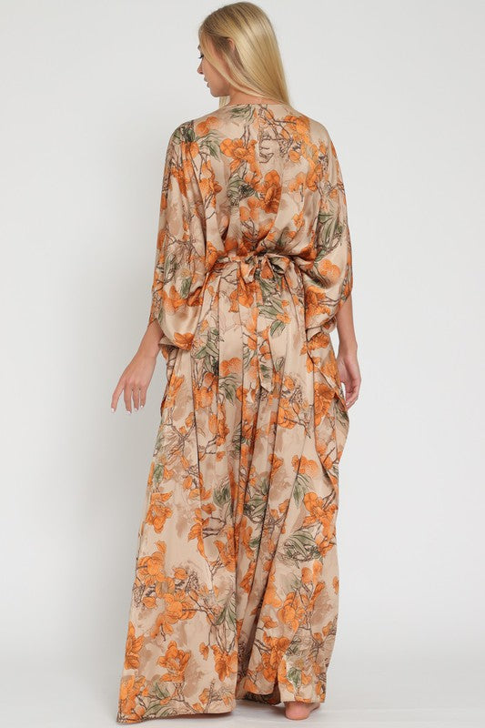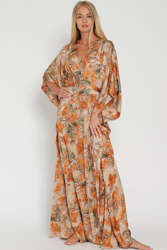 Mocha/Multi Kimono Sleeve Tie Back Waisted Maxi Dress