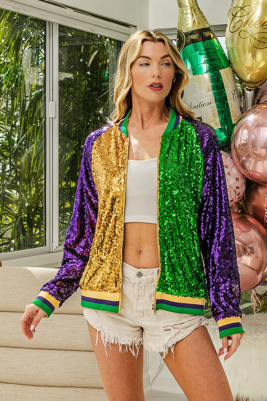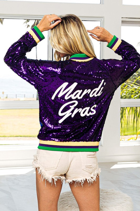 Back Mardi Gras Lettring Sequin Color Block Bomber Jacket