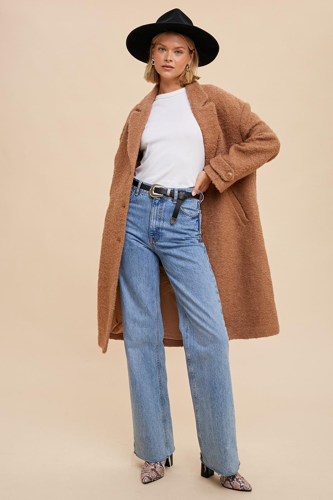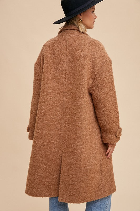 Thick Boucle Oversized Coat Features Lapels, Strap Cuffs With Buttons, And Side Pockets. Lined.