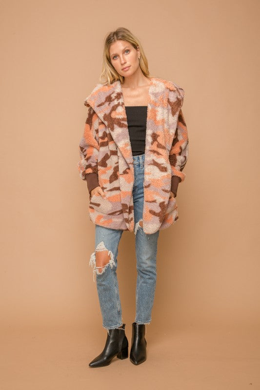 So Soft Camo Print Fur Open Sherpa Jacket-Self 100% Polyester Contrast 97% Acrylic 3% Spandex Model Height 5'8"Wearing A Small Size