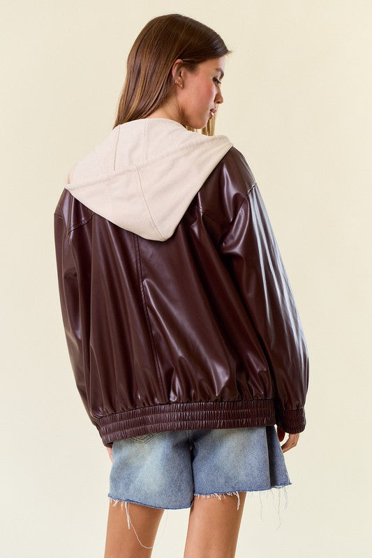 Chocolate/Lt.Beige Vegan Leather Hooded Jacket W/ Welt Pocket