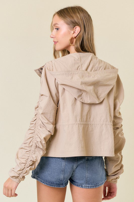 Cinched Sleeve Lightweight Hooded Jacket Self:100%NylonTotal Length 22 1/2"| Bust 19 1/2"| Sleeve Length 29"Model Is 5'8" | Bust 32b" | Waist 24" | Hips 33" Wearing Size Small