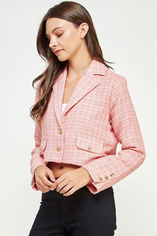 Cropped Blazer Jacket In Metallic Lurex Tweed Fabric. This Cropped Style Features Notched Lapels, A Deep V Neck, Pair Of Flap Pockets, Gold Button Detail, Long Sleeve With Buttoned Cuffs, Full Lining, And Front Double Button Closure.