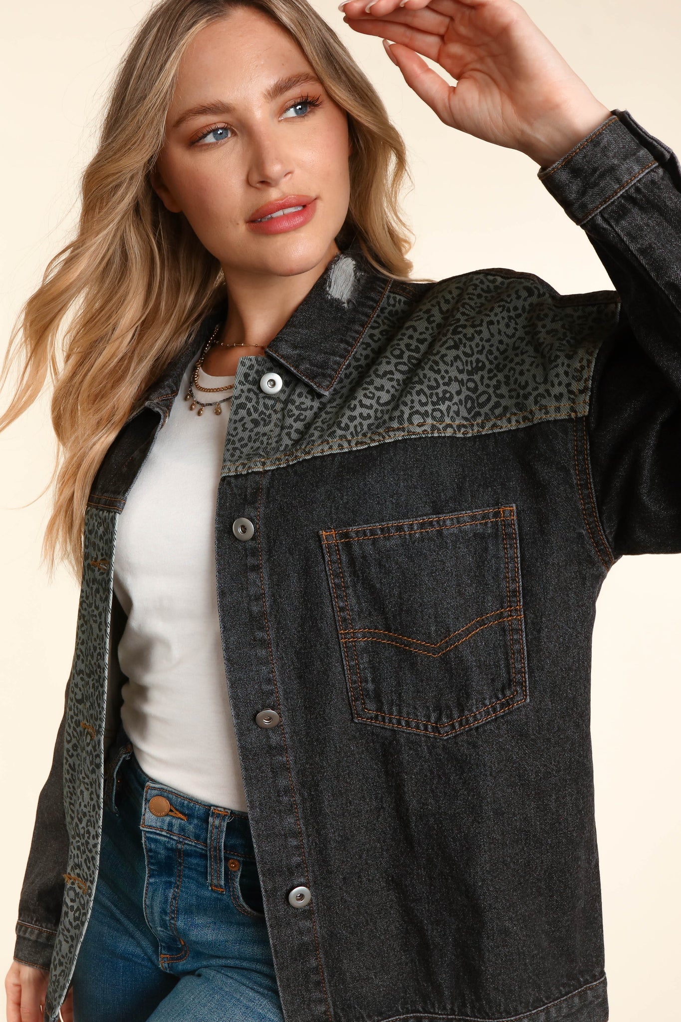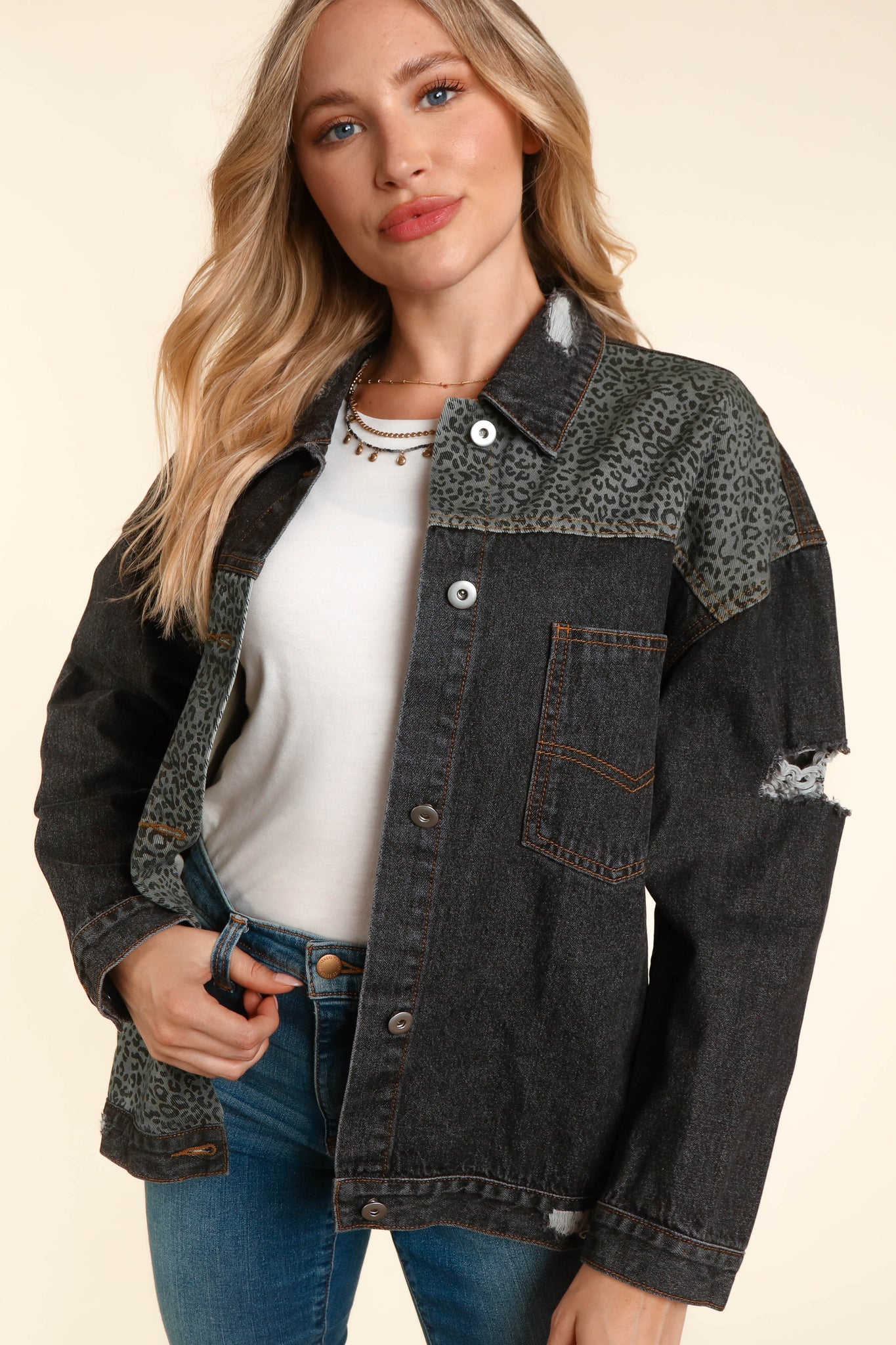 Distressed Leopard Animal Print Patched Long Sleeve Washed Denim Jacket With Buttons And PocketsFabric Contents100% Cotton