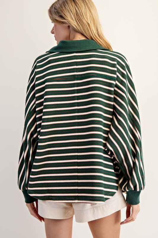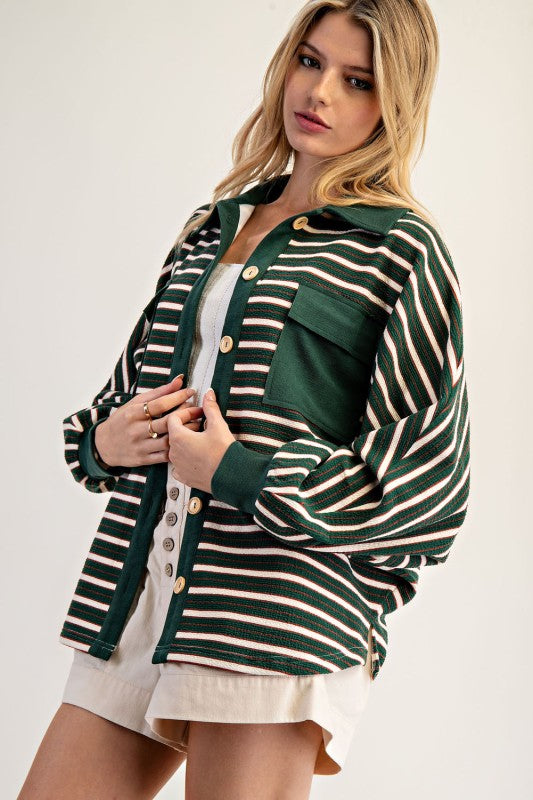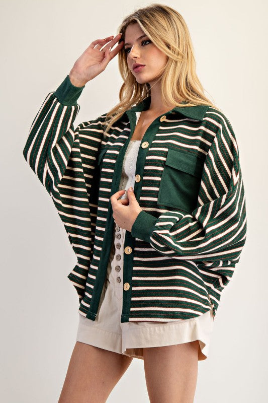 This Striped Button Up Jacket Features Oversized Batwing Sleeves, Dual Flap Chest Pockets, A Classic Point Collar, Wide Ribbed Cuffs And Hem, And A Relaxed Fit For An Effortlessly Cool, Vintage Inspired Look.