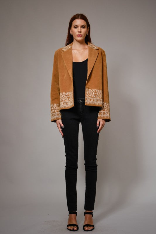 Structured Faux Suede Jacket With Floral Border Embroidery On Hem, Cuffs, And Collar For A Tailored Boho-Inspired LookModel Is 5'8" Tall And Wearing Size SmallFabric Contents50% Polyvinyl Chloride, 40% Polyester, 10% Viscose