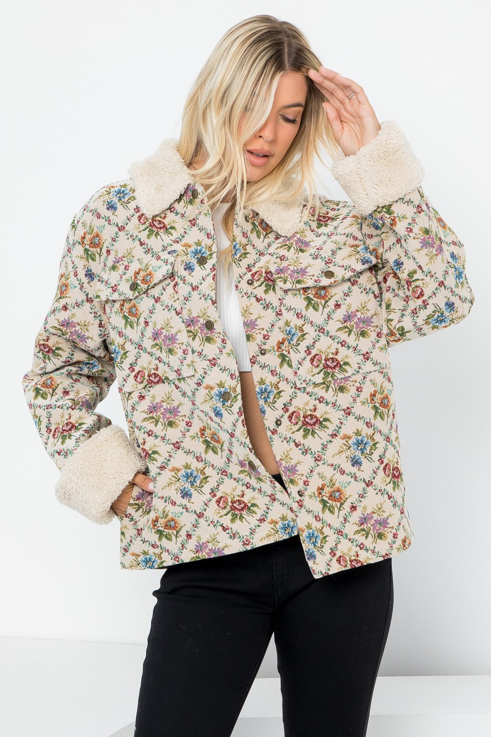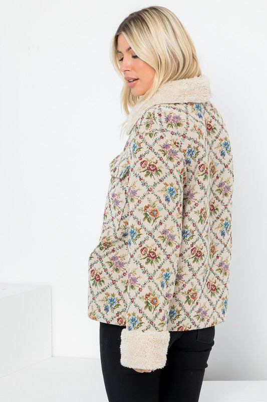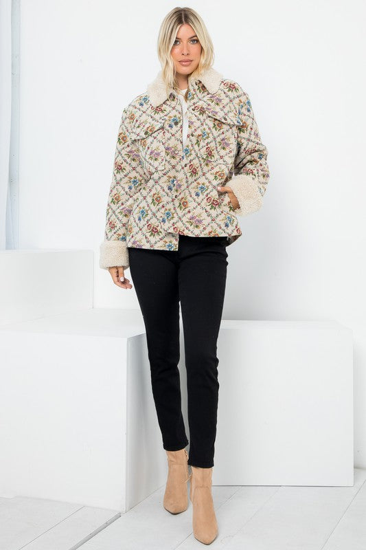 Oversized ShacketLong SleeveFloral Tapestry Jacquard FabricFront Snap Button Sherpa Lining & PocketsModel Size: Height: 5'10 / Bust: 34" / Waist: 24"Model Is Wearing Size: SmallBust: 43 1/2" Length: 26 3/4"Fabric Contents100% Polyester