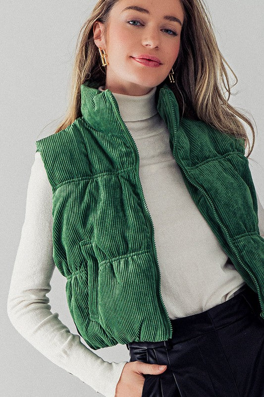 Green Stand Collar Cropped Corduroy Puffer Vest