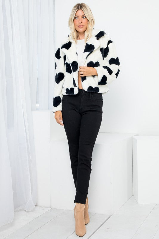 Regular Size Short JacketLong SleevesSuper Soft Faux Fur With Heart Print FabricOpen Front & Fully LinedModel Size: Height: 5'10 / Bust: 34" / Waist: 24"Model Is Wearing Size: SmallBust: 39Length: 22 1/2"Fabric Contents100% Polyester
