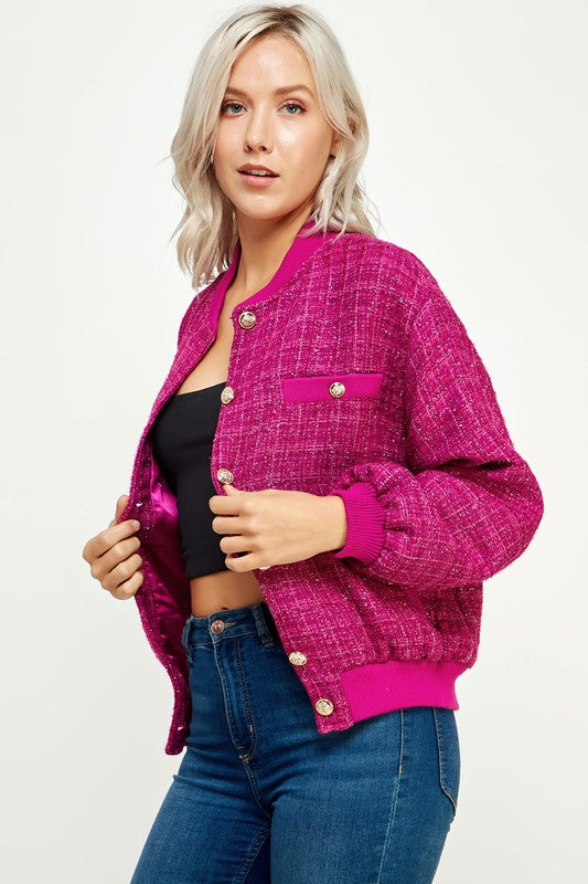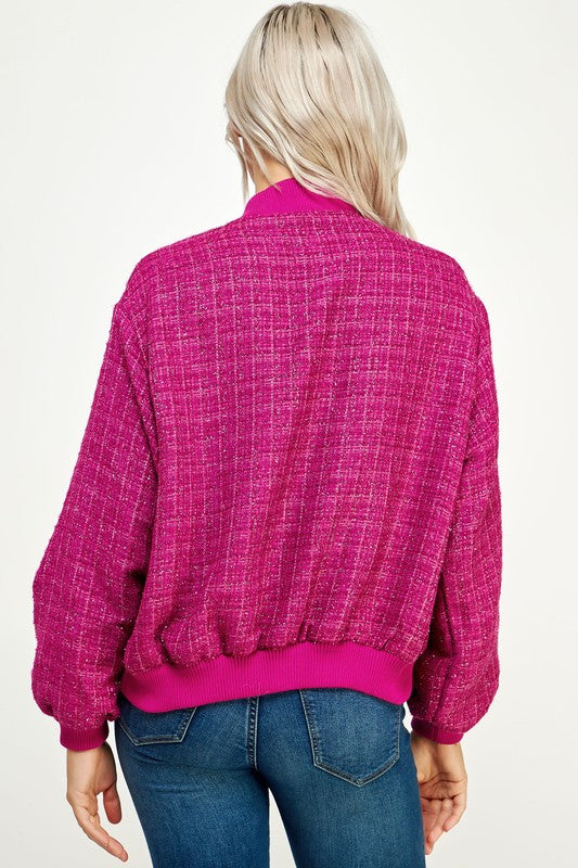 Magenta Metallic Tweed Bomber Jacket