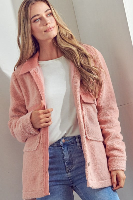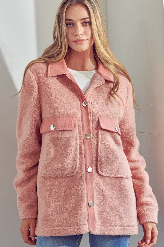 - Plus Sherpa Fleece Button Down Puffy Shirts Jacket- Oversized Two Chest Pockets- Corduroy Contrast With Collar Flap Pocket - Button Down Flannel- Oversized Fit- Inside Lining- Fuzzy Sherpa Fur Fabric- 100% Polyester