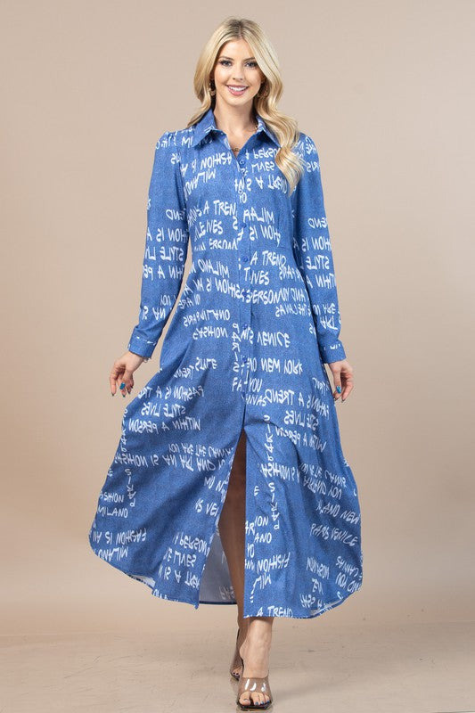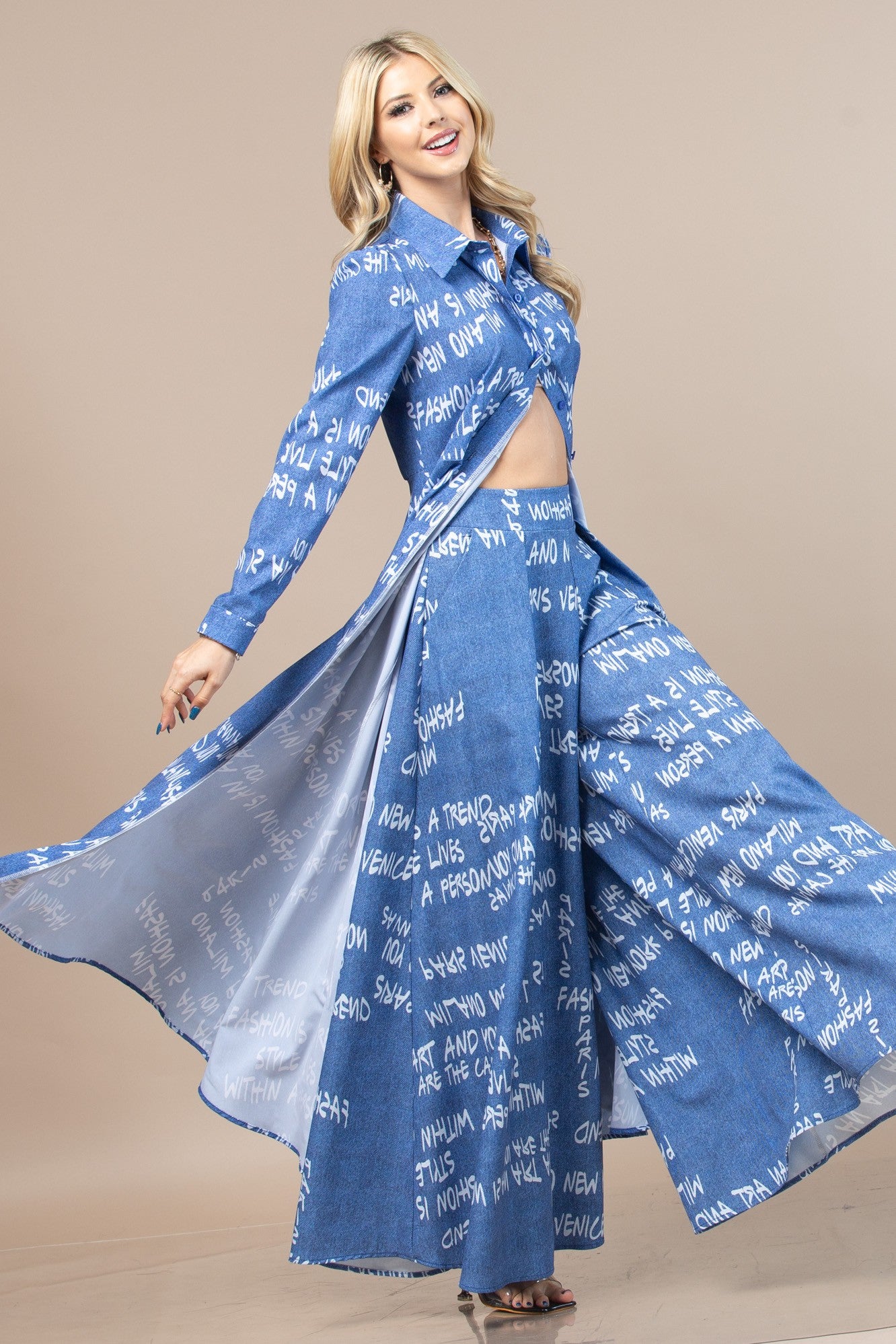 -Milano Graffiti Print -Collar Long Sleeves-Bottoms Down Duster, Dress You Can Wear Like A Dress Or JacketMade In USA. Model Wear S. Model: 5'8" 36-24-39. (No Top And Pants) -Limited QuantityFabric Contents95% Poly, 5% Spandex