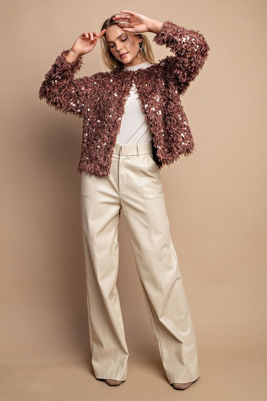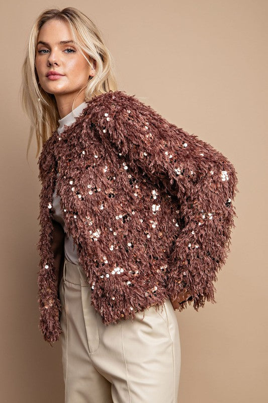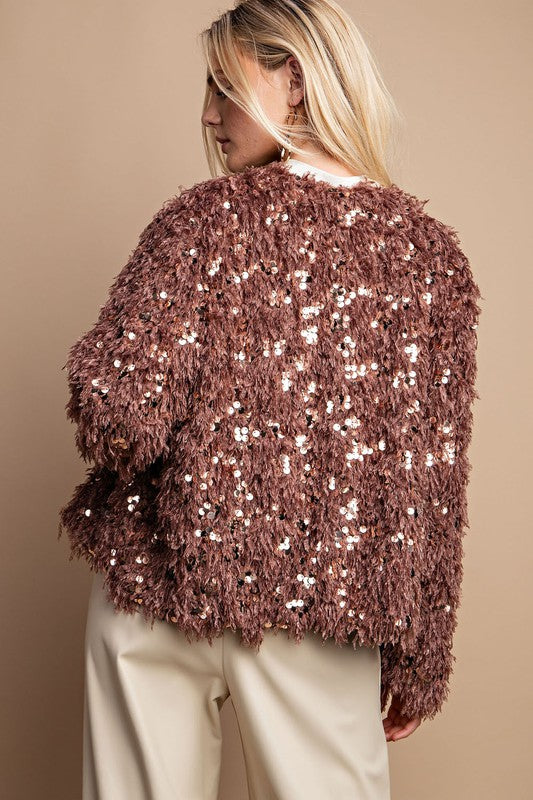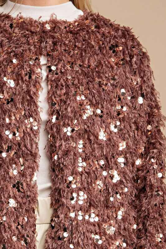 Open Front Sequin Shaggy Jacket With Hook And Eye Closure
