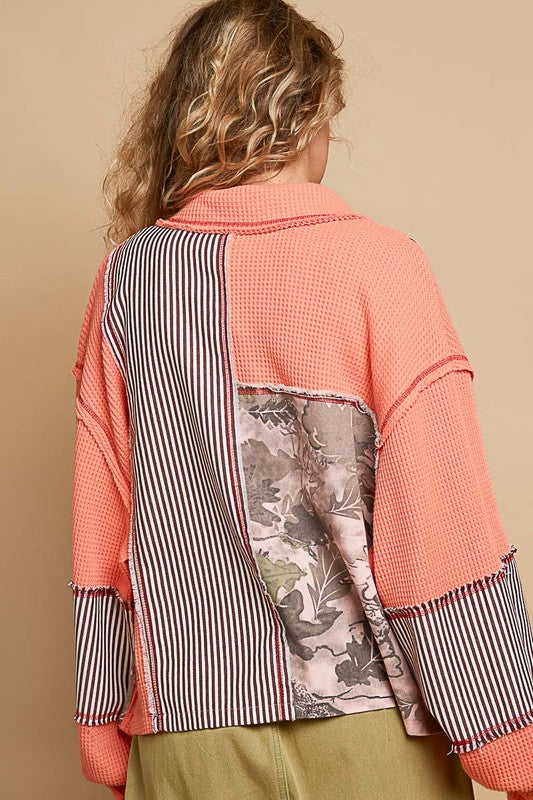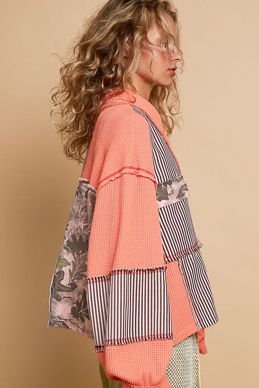 Designed In Collar Jacket, Balloon Sleeve, Relaxed Fit Top In Thermal And Printed Woven Mix With Frayed Edge Detail Pointed Stripes And Camo Pattern.