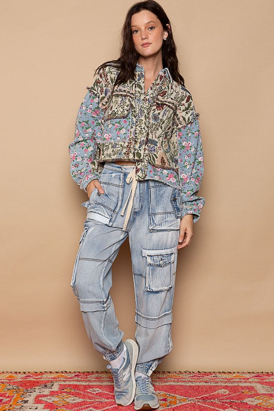 Designed In Button Down Oversized Fit Jacket In Floral Printed Denim And Jacquard With Embellish Trim, Frayed Edge On Entire Garmen, Uneven Hem
