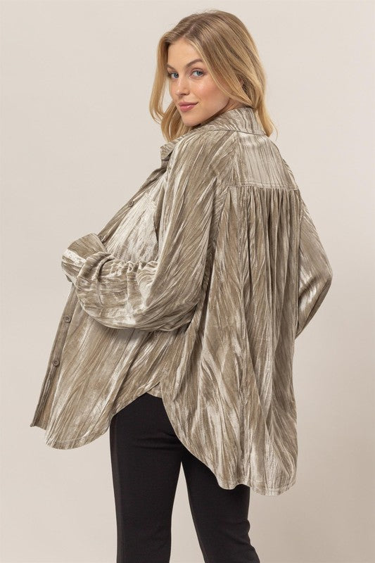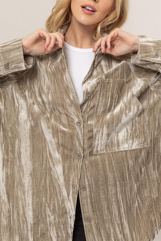 This Shirt Is Made From The Luxe Crushed Velvet Fabric That Creates A Mesmerizing Texture. The Shirt Boasts All The Classic Details Like A Point Collar, Chest Pocket, Drop Shoulders, Long Sleeves With Buttoned Cuffs And A Relaxed Button-Front Bodice.This Versatile Piece Can Be Worn As A Shirt Or Layered As A Jacket, Making It The Perfect Addition To Your Wardrobe For A Sophisticated Yet Cozy Look.