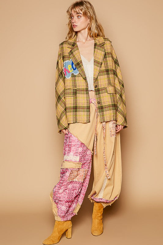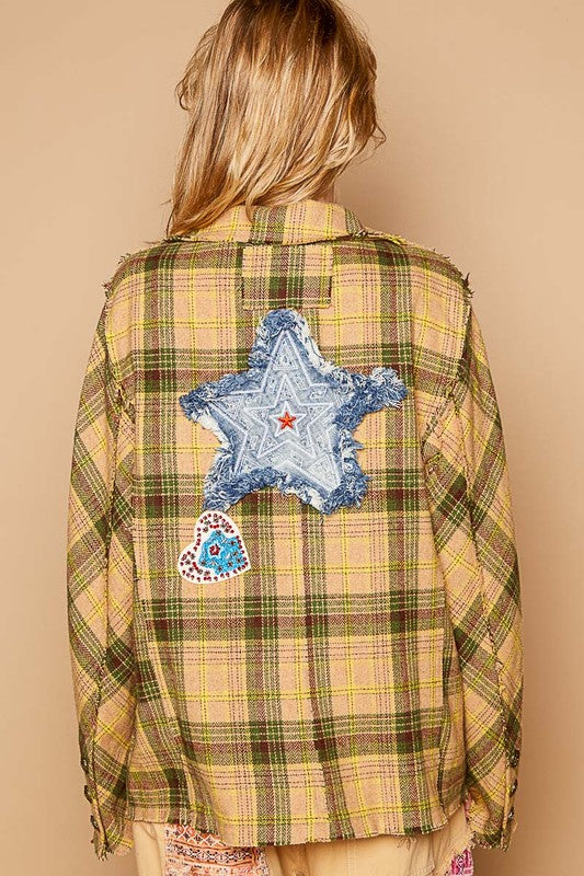 Designed In Jacket, Full Sleeve, Relaxed Fit Top In Woven With Patch Detail Pointed Plaid Pattern.Specs/Dimensions:- Bust : 22-3/4"- Length : 28"- Sleeve : 24"- Shoulder : 16-3/4"Fabric Contents80% Cotton, 20% Wool