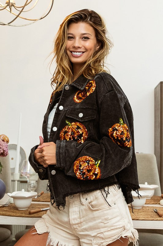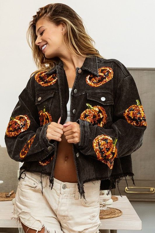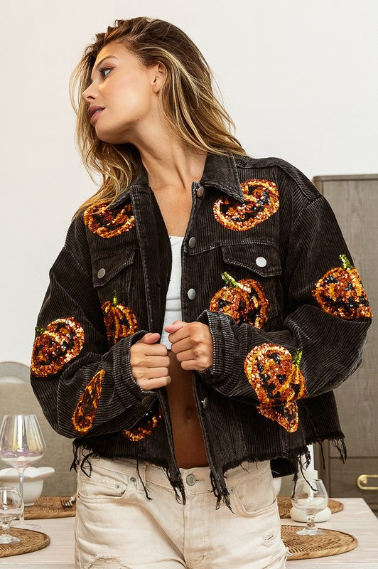 Pumpkin Sequin Embroidery Washed Corduroy Jacket