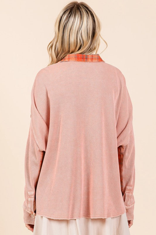Rust Mineral Wash Plaid Contrast Waffle Knit Shacket