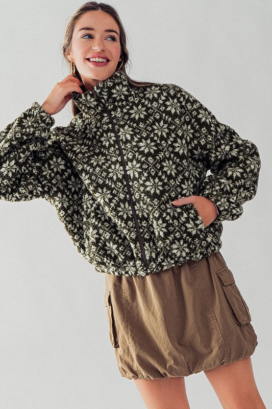 Fully Lined High Neck Sherpa Fleece Snow Flake Pattern Jacket