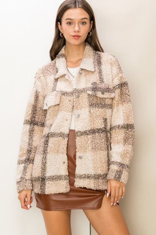 You'll Look Super Stylish With This Shacket! Soft Teddy Fur Construction With A Plaid Pattern Ups Its Chic Appeal And Shapes A Collared Neck, Long Sleeves And Buttoned Cuffs. The Button-Front Bodice Has Twin Front-Flap Pockets.