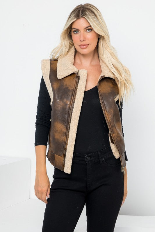 Regular Size Shearling VestVegan Leather Shearling FabricZip Up FrontPocket & Elastic Smocking WaistModel Size: Height: 5'10 / Bust: 34" / Waist: 24"Model Is Wearing Size: SmallBust: 38 1/2"Length: 23"Fabric Contents100% Polyurethane