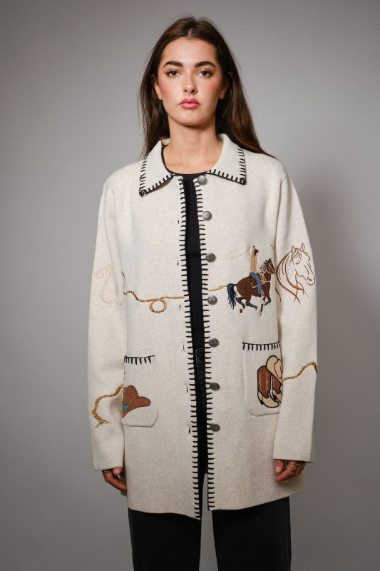 Relaxed Fit Button-Up Jacket With Western-Themed Embroidery, Metal Concho-Style Buttons, And Contrast Whipstitch Trim For A Statement Heritage Look80% Cotton, 20% WoolModel Is 5'8" Tall And Wearing Size Small