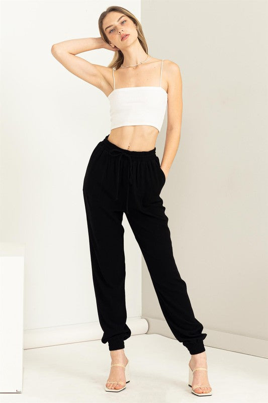 Step Into A Perfectly Laid-Back Look With These Joggers! These Casually Cute Pants Come With A High-Rise Drawstring Waistband And Tapered Pant Legs With Elastic Hems. Front Side Pockets And Back Patched Pockets Complete The Look.
