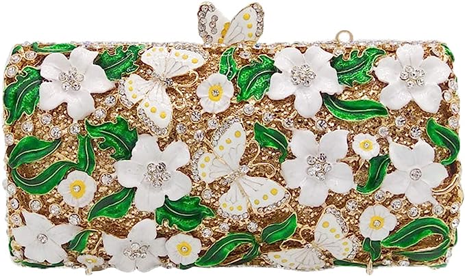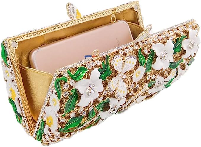 Design -The Clutch Is In Unique Design,The Flowers Are Decorating With The Shinny Rhinestones;The Kiss Metal Lock Clasp On The Top,It Is Convenient To Open Or Close,Keep Your Belonging Safe;The Flawless Interior Was Choosed The Silk Frabric Lining,Which Looks More Soft And Lustrous
