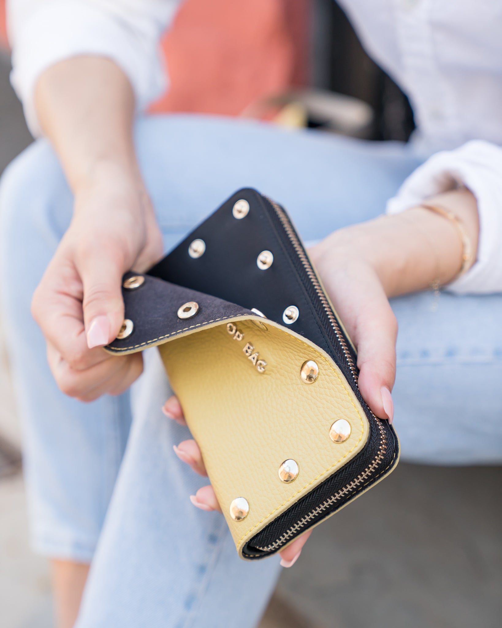 The Signature Snap Of Pop Bag In A Wallet. The Accordion-Style Wallet Features Two Full-Length Bill Compartments, Card Slots On Both Sides, And A Zippered Coin Purse In The Center. Zip-Around Closure, With An Attachable Wristlet.