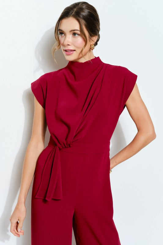 Burgundy High Neck Draped Waist Cap Sleeve Jumpsuit