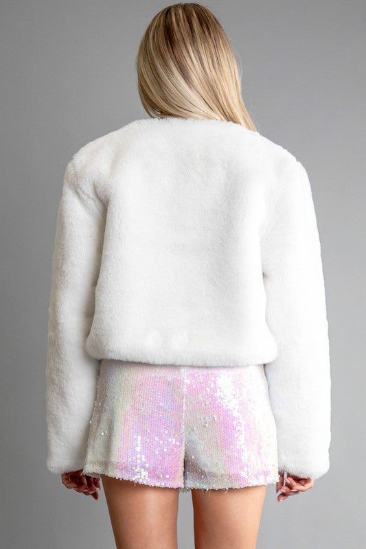 Off White Womens Fur Coat And Sequin Short Pants Set