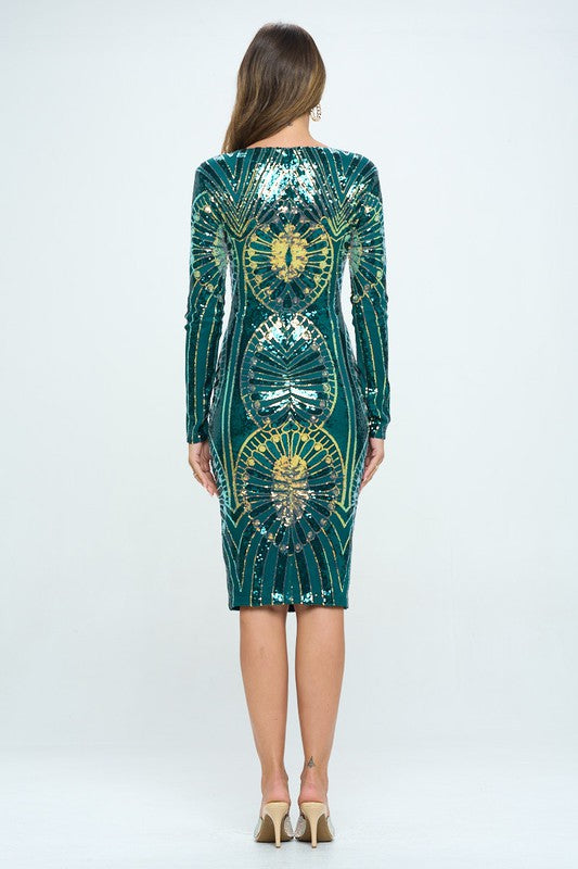 Long Sleeve Geometric Print Sequence Mid Length Dress With Invisible Back Zipper And V-Neck.