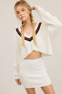 Preppy Two-Piece Ribbed-Knit Set Featuring A Low-Cut V-Neck Long Sleeve Knit Sweater Top With Contrast Stripe Designs Adorning Neckline, And A Matching Solid-Ribbed Knit Skirt With A Mini Silhouette, Elasticized Waistband, And A Pencil Fit. Wear This As A Co-Ord Set Or As Separates!